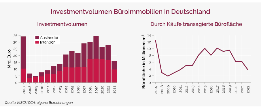 Über Jahre waren in- und ausländische Anleger sehr stark an in Deutschland gelegenen Büroimmobilien interessiert. So kam es in der der Pandemie vorausgehenden Zeit nach der Finanzmarktkrise zu einem nahezu kontinuierlichen Anstieg der Mittelzuflüsse, die mit rund 35 Mrd. € im Jahr 2019 ihren vorläufigen Höhepunkt erreichten. Darauf folgten zwei Pandemiejahre, mit einer abgeschwächten, aber gemessen am mittelfristigen Durchschnitt noch immer hohen Investmenttätigkeit. Das hat sich im letzten Jahr spürbar verändert. Nach Angaben von MSCI Real Capital Analytics ebbten im Jahr 2022 die Mittelzuflüsse auf etwa 15,8 Mrd. € ab, nach 27,5 Mrd. € im Jahr zuvor.