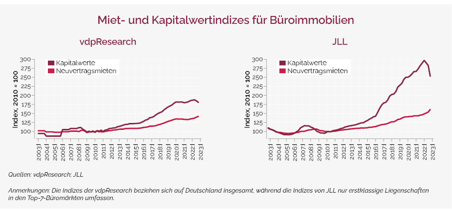 Zugleich gehen mit niedrigen Kredit- und Kapitalmarktzinsen geringe Fremdmittelkosten und – alles andere gleich – hohe Renditedifferenzen einher. Seit dem zweiten Quartal 2022 sind die Büroinvestmentmärkte auf steigende Kredit- und Kapitalmarktzinsen sowie auf steigende Liegenschaftszinsen und Nettoanfangsrenditen eingestimmt. Das zeigen gleichermaßen der von vdpResearch ermittelte Index der Liegenschaftszinsen für Büroimmobilien und die Nettoanfangsrenditen für erstklassige Büroimmobilien von JLL, wobei die zyklische Dynamik der JLL-Größe wesentlich ausgeprägter ist.