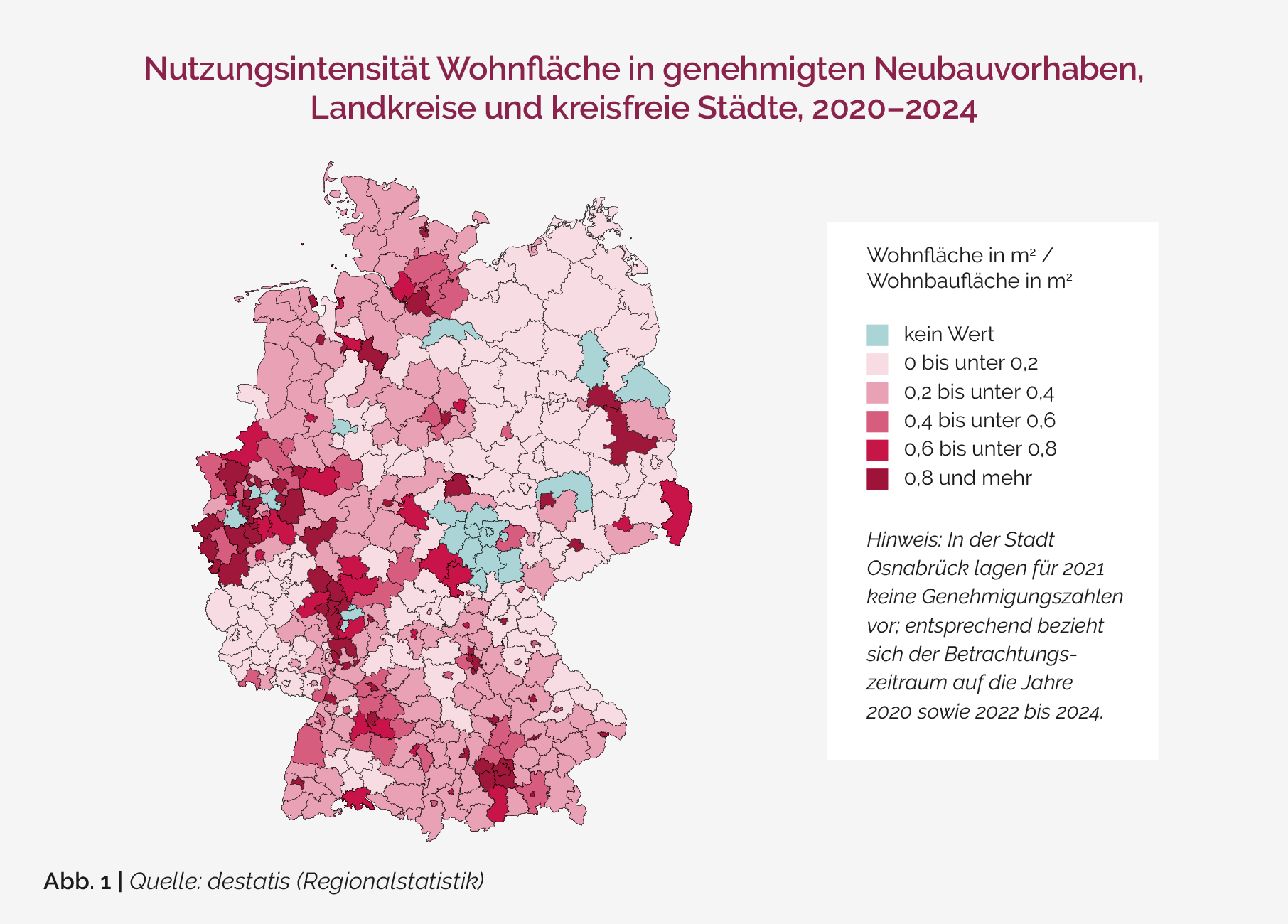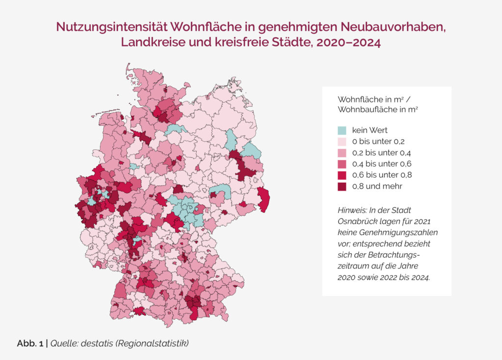 Ein echter Zielkonflikt für viele Gemeinden in Deutschland: Sie müssen für zusätzlichen Wohnraum sorgen, sollen aber möglichst wenig Bodenfläche neu in Anspruch nehmen und versiegeln. Wir haben – regional differenziert – untersucht, wie intensiv neues oder vorhandenes Bauland für wohnbauvorhaben genutzt wird. Eine intensive Nutzung bedeutet, dass  besonders viel Wohnfläche in Neubauten je zusätzlichem Quadratmeter Wohnbaufläche vorgesehen ist. Das ist in der Regel bei mehrstöckigen Mehrfamilienhäusern der Fall. Dafür wird ein Indikator herangezogen, der genehmigte Wohnfläche (in neuen Gebäuden, in m²) ins Verhältnis zum  Anstieg der Wohnbaufläche (in m²) setzt.¹ Diese umfasst auch Freiflächen wie Gärten und beeinflusst damit Bevölkerungsdichte und Lebensqualität.