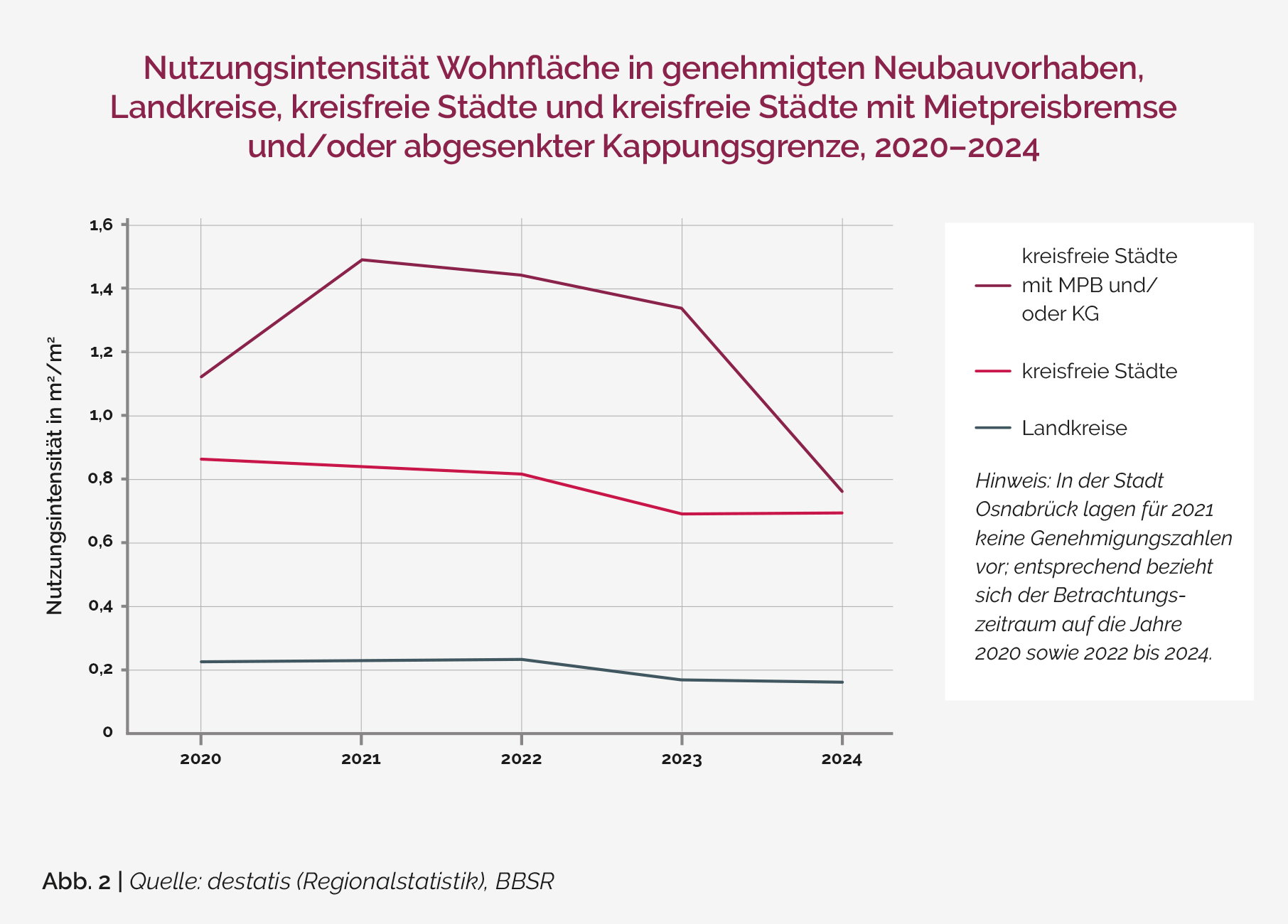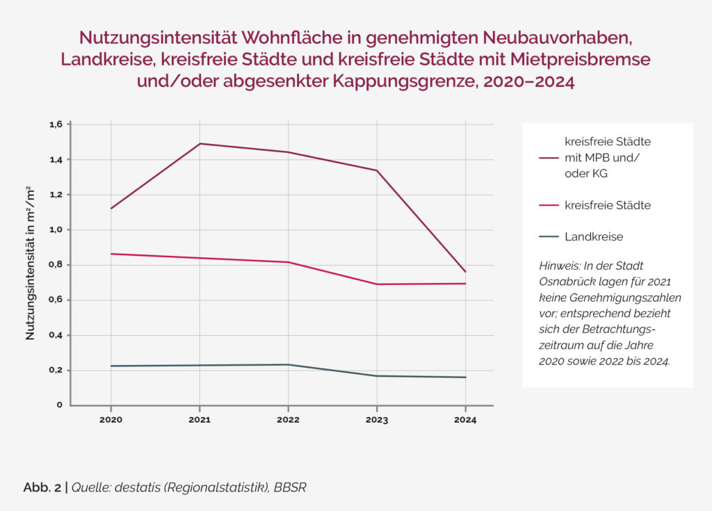 Zusätzlich zur durchschnittlichen Entwicklung der letzten fünf Jahre wird im Folgenden noch die zeitliche Entwicklung auf aggregierter Ebene betrachtet, um mögliche Trends zu identifizieren. Neben der Unterscheidung nach Landkreisen und kreisfreien Städte werden aus letzteren noch diejenigen Städte separat ausgewiesen, in denen aktuell (Stand Januar 2026²) die Mietpreisbremse, eine abgesenkte Kappungsgrenze oder beides gilt. Beide mietpolitischen Instrumente finden in Märkten Anwendung, die von der jeweiligen Landesregierung als angespannt eingestuft wurden. In diesen Städten ist eine intensive Nutzung des Baulandes besonders wichtig, weil dort in der Regel ein Nachfrageüberhang besteht.