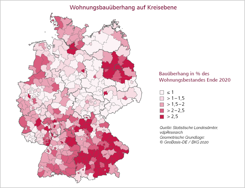 Diesen laufen die Fertigstellungen sehr deutlich hinterher. Seit dem Jahr 2009 übersteigt die Zahl der genehmigten Wohnungen die Zahl der fertig gestellten Wohnungen pro Jahr um rund 55 Tsd. Einheiten. Die Folge ist ein mittlerweile sehr hoher, sich weiter aufbauender Bauüberhang. Zum Jahresende 2020 waren es rund 780 Tsd. Wohnungen, das sind 1,82 % des gesamten Wohnungsbestandes der Bundesrepublik Deutschland. Vergleichbar hohe Zahlen wurden bei deutlich mehr genehmigten und fertig gestellten Wohnungen zuletzt Mitte der 1990er-Jahre gemessen.