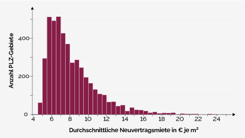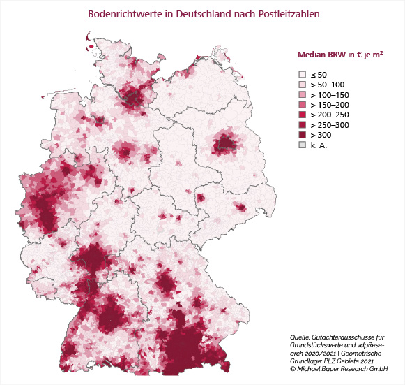 Hier ist auf der Ebene von Postleitzahlgebieten das Bodenpreisniveau für Wohnbauland anhand von mittleren Bodenrichtwerten für wohnwirtschaftliche Liegenschaften abgebildet. Die mit weitem Abstand höchsten Bodenrichtwerte werden für Grundstücke in München, Hamburg, Düsseldorf, Berlin und Frankfurt erzielt. Hier liegen die Werte für so manches Grundstück zwischen 10.000 und 25.000 € je m². Dem stehen am anderen Ende der Skala Bodenrichtwerte von weniger als 100 € je m² in wirtschaftsschwachen und dünn besiedelten Gebieten gegenüber.