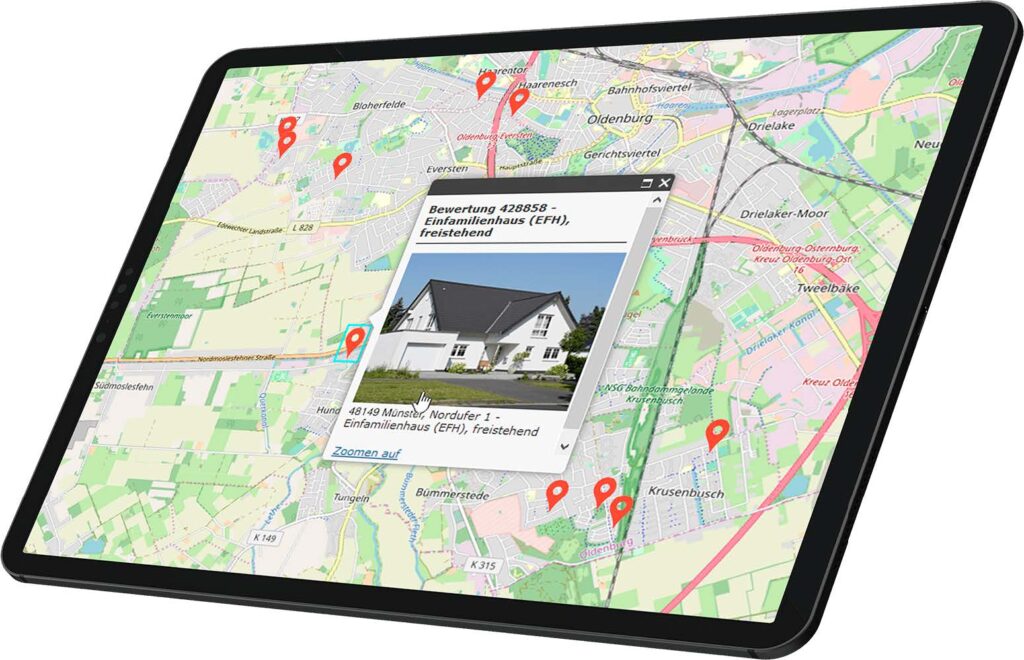 – von bewertungsrelevanten Objekt- und Marktdaten, Karten und Lageeinschätzungen, die die Bewertung empirisch absichern und den Prozess stark beschleunigen.