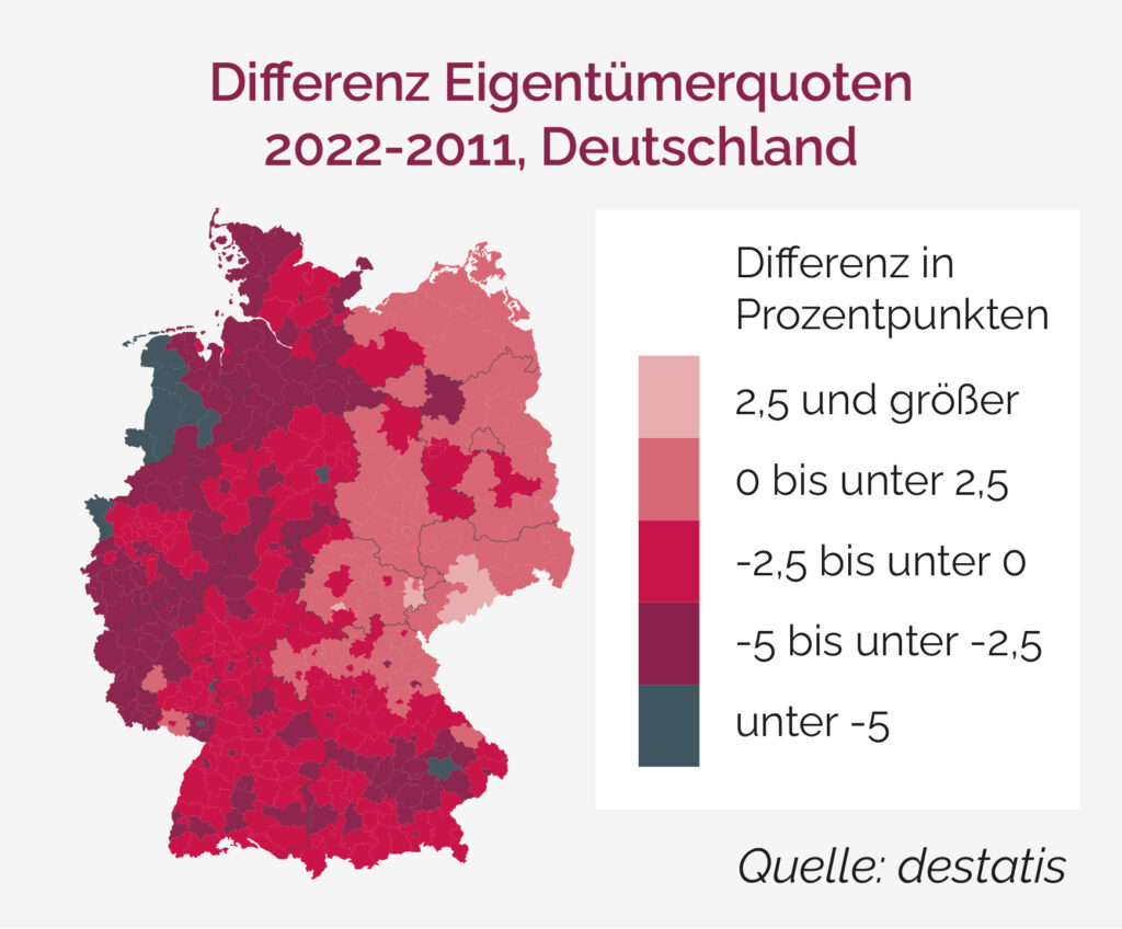 Bundesweit verringerte sich die Eigentümerquote zwischen den beiden Zensus um ca. 1,5 Prozentpunkte (%p) von 45,9 % im Jahr 2011 auf 44,3 % 2022. Die Veränderungen in den 400 Kreisen fielen jedoch sehr unterschiedlich aus, nicht zuletzt wegen der regional unterschiedlichen Entwicklungen der Haushaltseinkommen und Immobilienpreise. Bis auf wenige Ausnahmen entwickelten sich die Eigentümerquoten in den neuen Ländern positiv, während die ehemalige Bundesrepublik größtenteils Rückgänge verzeichnete. Als Erklärungsansätze dafür können u.a. die unterdurchschnittlichen Preisniveaus sowie die historisch bedingte Eigentumsstruktur und damit verbundene Nachholeffekte dienen. Unter den alten Bundesländern fielen die negativen Veränderungen im Norden, westlich des Rheins sowie in der oberen Südhälfte Bayerns deutlicher aus, wobei die Eigentumsquoten in vielen der zugehörigen Kreise 2011 überdurchschnittlich waren.