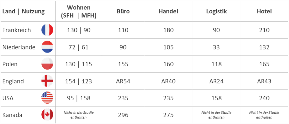 Die Top 15 %-Kriterien für ausgewählte europäische Länder sowie die USA und Kanada. Die Schwellenwerte sind eine Empfehlung und können sich ändern. Stand Januar 2024. © Drees & Sommer