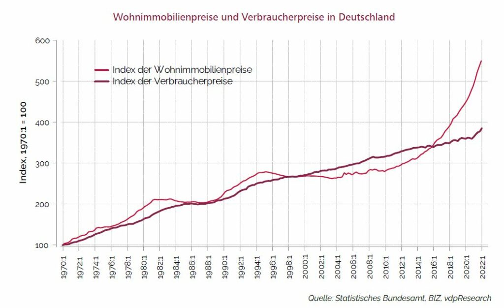 Anmerkung zu den Zeitreihen: Der Verbraucherpreisindex bezieht sich für den Zeitraum von 1970 bis 1990 auf den Gebietsstand „Früheres Bundesgebiet“, danach auf die Bundesrepublik Deutschland. Die Preise für Wohnimmobilien wurden für den Zeitraum von 1970 bis 2002 von der Bank für Internationalen Zahlungsausgleich (BIZ) übernommen. Hierbei handelt es sich für die Jahre von 1970 bis 1974 um Bauleistungspreise, für die Jahre von 1975 bis 1989 und 1990 bis 1994 um Preise für selbstgenutztes Wohneigentum in 50 westdeutschen Städten respektive in 100 westdeutsche Städte jeweils einschließlich West-Berlin. Danach umfasst die Datengrundlage bis 2002 125 Städte in Deutschland insgesamt. Für den Zeitraum von 2003 bis 2022 wurde auf den vdp-Preisindex für selbstgenutztes Wohneigentum zurückgegriffen, der sich auf die Bundesrepublik Deutschland insgesamt bezieht.