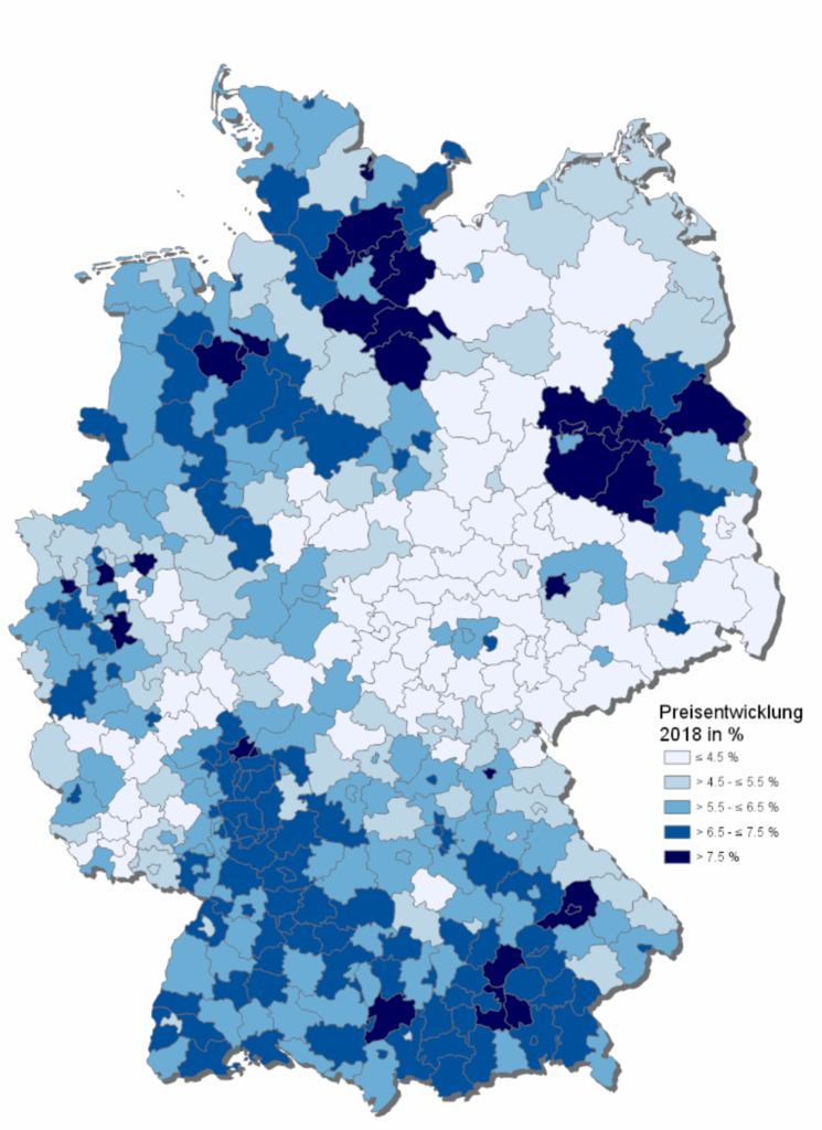Auf dem Wohnungsmarkt ist die Dynamik der Preisentwicklung nach wie vor regional sehr unterschiedlich. Betrachtet man allein das Segment „Selbst genutztes Wohneigentum“, wo die Preisentwicklung von Eigentumswohnungen und Eigenheimen zusammengefasst betrach-tet wird, wurden 2018 Steigerungsraten in einer Spanne von 1,4 % bis rund 11 % ermittelt. Spitzenreiter ist dabei Berlin. In München und Hamburg hat sich das Wachstum dagegen etwas abgeschwächt hat. Wie die nachfolgende Karte zeigt, hat dagegen in beiden Fällen der Preisanstieg in den angrenzenden Landkreisen an Dynamik zugenommen.