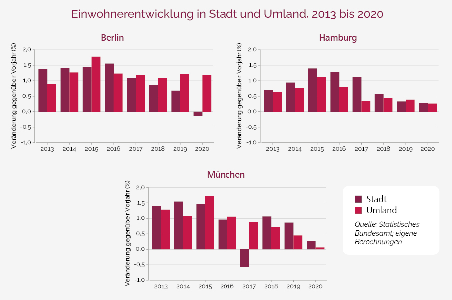 Wie für viele andere Aspekte der sozioökonomischen Entwicklung, so war und ist die Pandemie auch für das Wanderungsverhalten und die Einwohnerentwicklung von hoher Bedeutung. Die Zahlen für das Jahr 2020 deuten dies mit Nachdruck an: In dem ersten Pandemiejahr stieg die Einwohnerzahl in den drei Städten nur noch um 0,05 %. Die Stadt Berlin verzeichnete dabei zum Jahresende 2020 sogar weniger Einwohner als 12 Monate zuvor, während die beiden anderen Städte nur noch leichte Zuwächse von jeweils rund 0,3 % verbuchen konnten. Wie die Kernstädte selbst blieb auch das Umland hinter der Entwicklung der letzten Jahre zurück, ausgenommen Berlin. In dem 45-Minuten-Radius der Hauptstadt stieg die Einwohnerzahl mit knapp 1,2 % ähnlich stark wie in den sieben Jahren zuvor. Die damit korrespondierenden Wachstumsraten für die Gebiete um Hamburg und München herum betrugen lediglich 0,26 % respektive 0,06 %. Das heißt, nur in Berlin konnte das Umland gegenüber der Kernstadt an Bedeutung gewinnen.