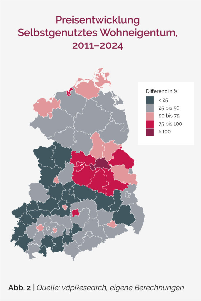 Abbildung 1 veranschaulicht die relative Veränderung der Bevölkerungsstruktur in zwei Alterskohorten. Allgemein ergibt sich bei der Entwicklung des Anteils der unter 40-Jährigen in Ostdeutschland (ohne Berlin) ein Rückgang von 0,3 %, während der Anteil der über 65-Jährigen um 16 % gestiegen ist. In den meisten Großstädten hat der Anteil der unter 40-Jährigen seit 2011 zugenommen, ebenso ist er in einigen Mittelstädten und in den meisten brandenburgischen Landkreisen um Berlin gestiegen. Leipzig zeigt dabei mit 9,9 % den höchsten Zuwachs. Dass sich die Stadt im Beobachtungszeitraum deutlich verjüngt hat, beweist auch der Rückgang des Anteils der über 65-Jährigen um 12,5 %. Wie die Bevölkerungsentwicklung mit Veränderungen der Immobilienpreise einhergeht, zeigt die in Abbildung 2 dargestellte nominale Preisentwicklung für selbstgenutztes Wohneigentum von 2011 bis 2024. Die hierbei verwendete Vergleichskennzahl gewichtet die Preisentwicklung von Ein-/Zweifamilienhäusern und Eigentumswohnungen anhand der Wohnstruktur in den jeweiligen Städten und Kreisen. Dementsprechend ist die Gewichtung von Eigentumswohnungen in Großstädten höher1. Zu beachten ist, dass die relative Preisänderung abgebildet wird. Die stärksten Preisentwicklungen verzeichnen Berlin mit +151,9 % und Potsdam mit +114,6 %.