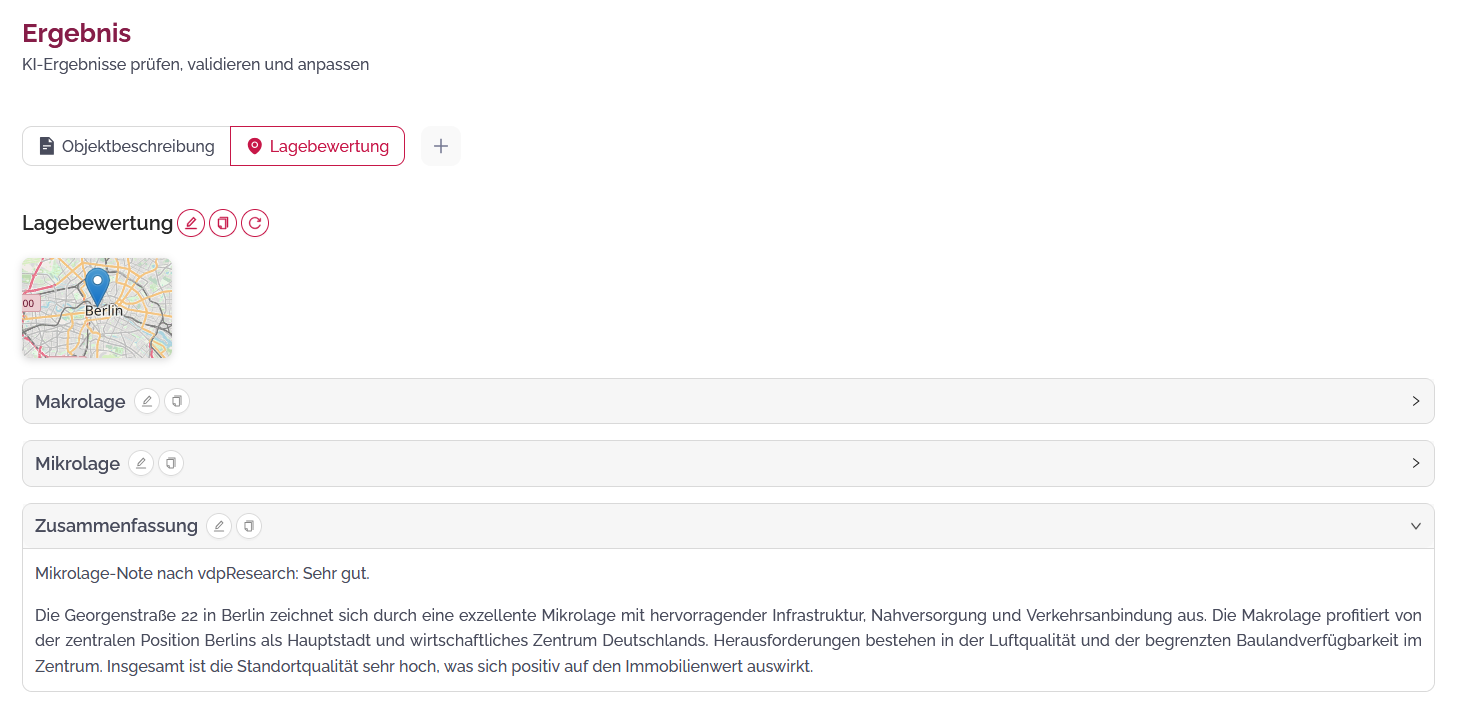 Die Wahl des Standorts ist einer der entscheidenden Faktoren für die Bewertung einer Immobilie. Unsere KI-gestützte Lagebewertung, die u. a. auch auf die qualitätsgeprüften Daten der vdpResearch zugreift, aber auch weitere relevante Quellen einbezieht, liefert Ihnen eine prägnante, nachvollziehbare Einordnung auf Mikro- und Makroebene – basierend auf der einfachen Eingabe einer Adresse.