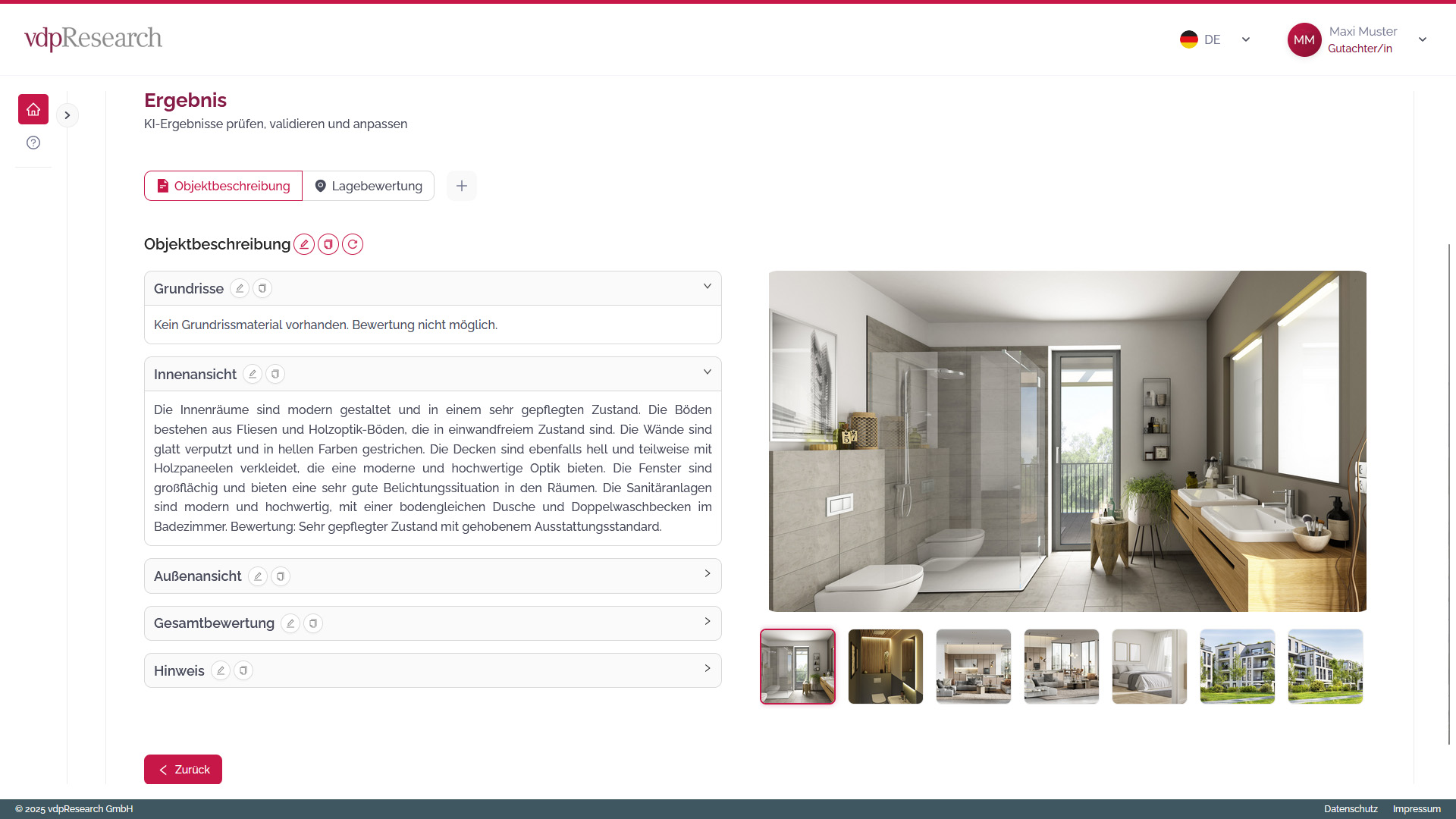 Ihr Vorteil: Sie erhalten eine zeitgemäße, KI-gestützte Objektbeschreibung, die sofort in Gutachten eingefügt werden kann und eine zuverlässige Grundlage für weitere Analysen bietet.