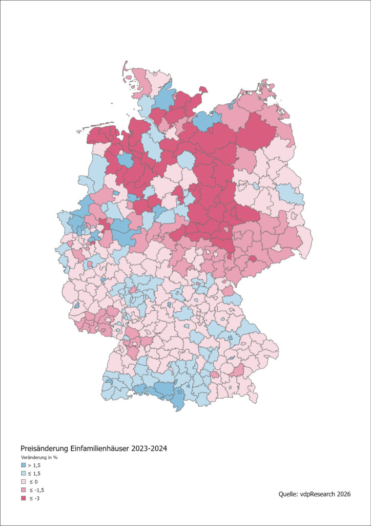 Die Abbildung zeigt die Entwicklung der Preise bei Ein- und Zweifamilienhäuser 2023-2024 in Deutschland nach Landkreisen:
