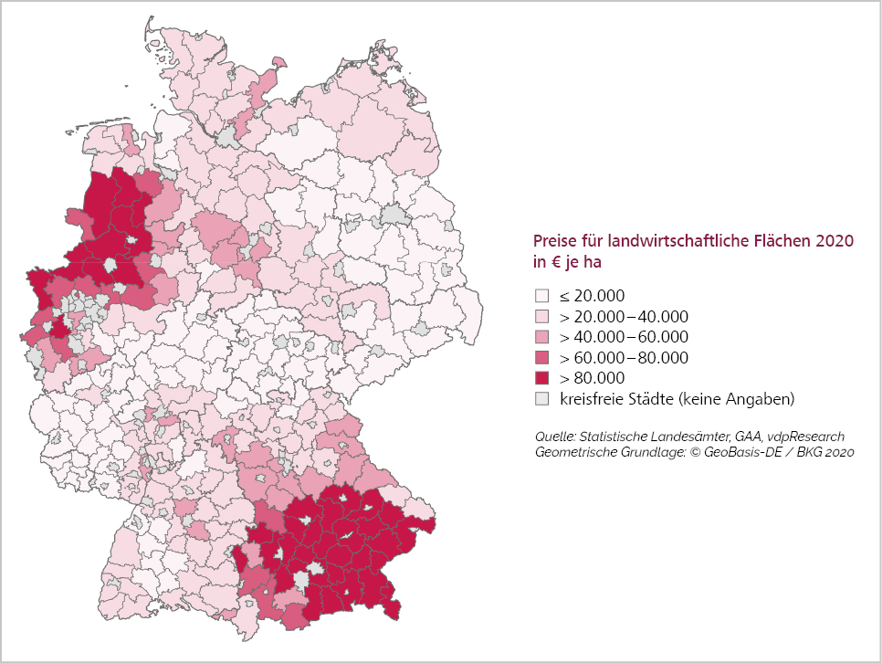 Im Jahr 2020 legten die Preise in Deutschland insgesamt um 4,7 % zu, in den alten Bundesländern betrug der Anstieg 5,1 %, in den neuen Bundesländern verteuerten sich die Flächen um 4,0 %.