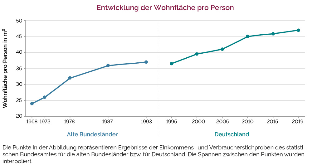 Allgemein formuliert: Die wichtigste ökonomische Einflussgröße auf die Wohnungsnachfrage ist das verfügbare Einkommen pro Kopf. Das Einkommen ist sowohl im Querschnitt als auch in der zeitlichen Entwicklung stark mit der Pro-Kopf-Wohnflächennachfrage korreliert. Entsprechend hat das  Einkommenswachstum zusammen mit altersstrukturellen Bevölkerungsveränderungen dazu beigetragen, dass seit den 1950er Jahren die Zahl der Personen je Haushalt sinkt und der Wohnflächenverbrauch pro Person stark steigt. Die Grafik zeigt, dass die Pro-Kopf-Wohnfläche allein zwischen 1995 und 2019 um rund 28 %, von 36,7 m² auf 47 m², angestiegen ist.