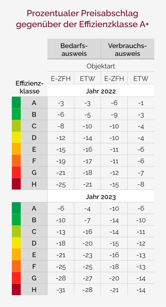 Die Energieausweise für Eigenheime messen zu 42 % den Energieverbrauch, ansonsten den Energiebedarf. Bei den Eigentumswohnungen beträgt das Verhältnis von Verbrauchsausweis zu Bedarfsausweis 3 zu 1. Die nachstehende Tabelle zeigt das Ergebnis der hedonischen Regression für die Jahre 2022 und 2023, wobei für das Jahr 2023 nur Daten aus den ersten drei Quartalen berücksichtigt werden konnten. Eine über die Tabelle hinausgehende zeitliche Darstellung ist möglich, ihre Aussagekraft ist aber wegen veränderter gesetzlicher Grundlagen begrenzt.