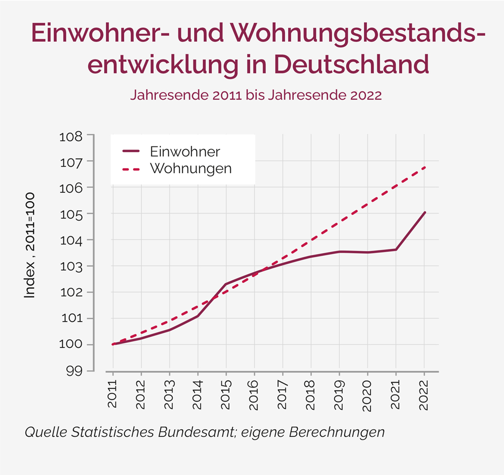 Zum Jahresende 2011 gab es in der Bundesrepublik Deutschland 40,6 Millionen Wohnungen, zum Jahresende 2022 waren es 2,74 Millionen mehr. Nimmt man für jede dieser neu entstandenen Wohnung eine durchschnittliche Belegung von zwei Personen an, hätte die Bevölkerung in den letzten elf Jahren um 5,5 Millionen Personen ansteigen können, ohne die Wohnungsversorgung rechnerisch zu verändern. Tatsächlich stieg die Bevölkerung aber weniger stark. Zum Jahresende 2022 lebten in der Bundesrepublik mit 84,3 Millionen Menschen, 4 Millionen mehr als Ende des Jahres 2011.