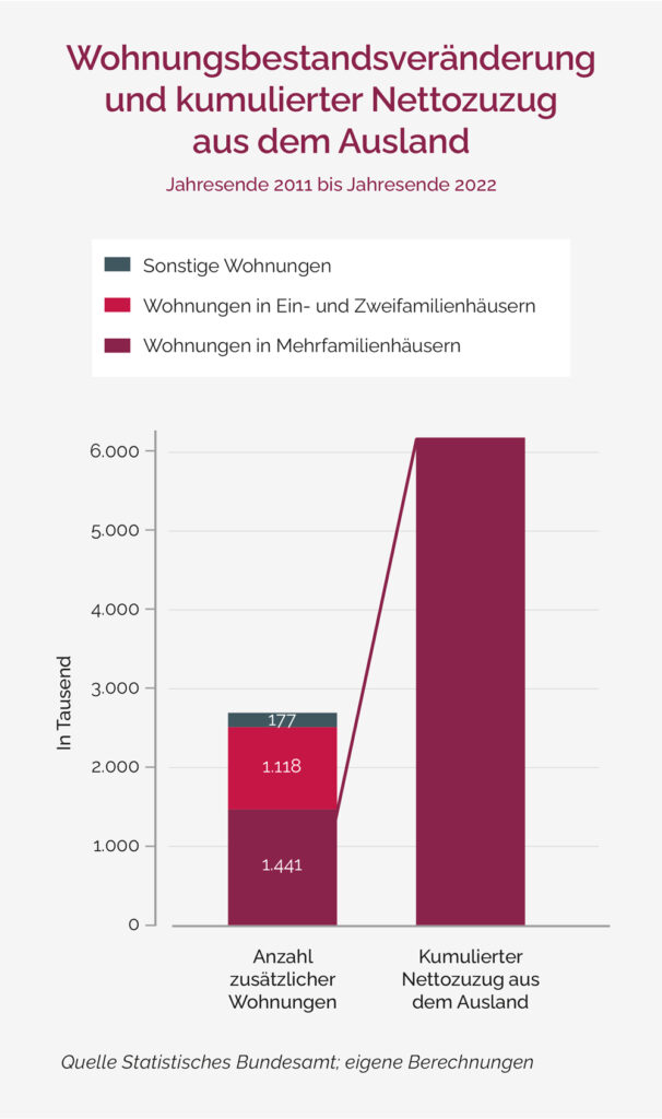 Zuziehende sind vor allem auf Mietwohnungen angewiesen. Diese machen nur etwa die Hälfte der seit dem Jahr 2011 neu entstandenen Wohnungen aus, die andere Hälfte entfällt vor allem auf Eigenheime. Nimmt man mangels einer Mietwohnungsbestandsstatistik den Geschosswohnungsbestand als Orientierung, erhält man ein Plus von 1,44 Millionen (Miet-)Wohnungen. Wird dieses Plus dem Nettozuzug gegenübergestellt, zeigt sich, dass auf eine zusätzliche Mietwohnung nicht 2 Personen, sondern mindestens 4,2 Personen aus dem Ausland entfallen. Hinzu kommt mehr als der eine oder andere Inländer.